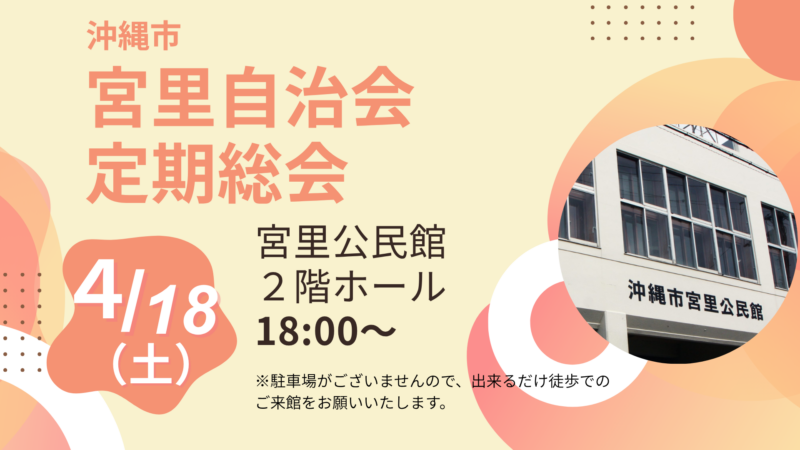 定期総会のおしらせ 2026年4月4日 会員の皆さまにはご多忙のこととは存じますが、ぜひ多くの皆さまにご参加いただけますと幸いです。なお、ご都合によりご参加いただけない場合は、委任とさせていただきますので、あらかじめご了承ください。また、総会終了後には懇親会も予定しております。皆さまとの交流の場になればと思っておりますので、ぜひご参加ください。ーー令和8年4月18日(土)宮里公民館 2階ホール18:00~ーー※駐車場がございませんので、出来るだけ徒歩でのご来館をお願いいたしますm(_ _)m - このページをSNSでシェアする -